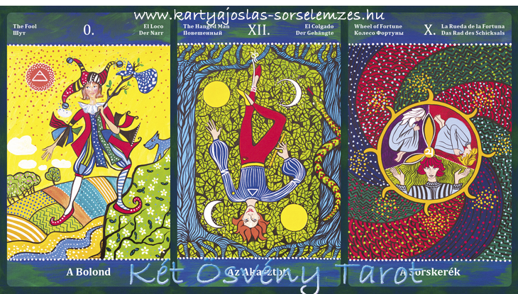 Mai lapjaink: a Bolond (0), az Akasztott (XII) és a Sorskerék (X)