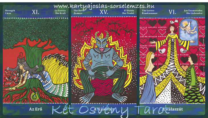Mai lapjaink: az Erő (XI), a Kísértés (XV) és a Válaszút (VI)