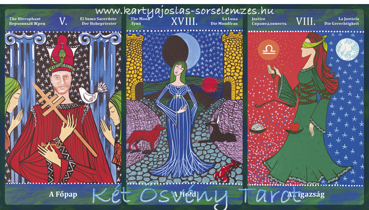 Mai lapjaink: a Főpap (V), a Hold (XVIII), az Igazság (XI)