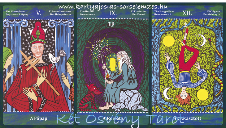 Mai lapjaink: a Főpap (V), a Remete (IX), az Akasztott (XII)