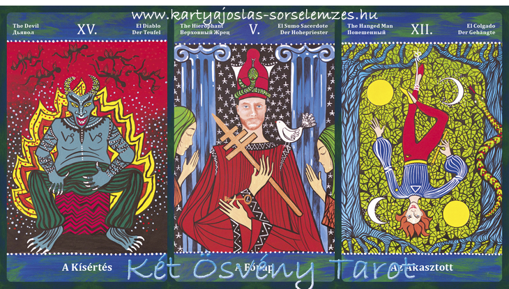 Mai lapok: a Kísértés (XV), a Főpap (V) és az Akasztott (XII)