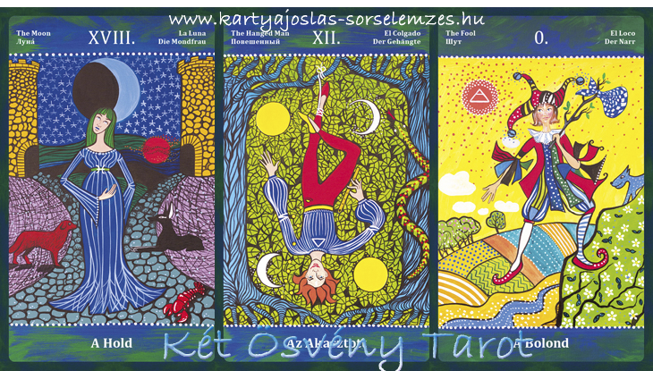 Mai lapjaink: a Hold (XVIII), az Akasztott (XII) és a Bolond (0)