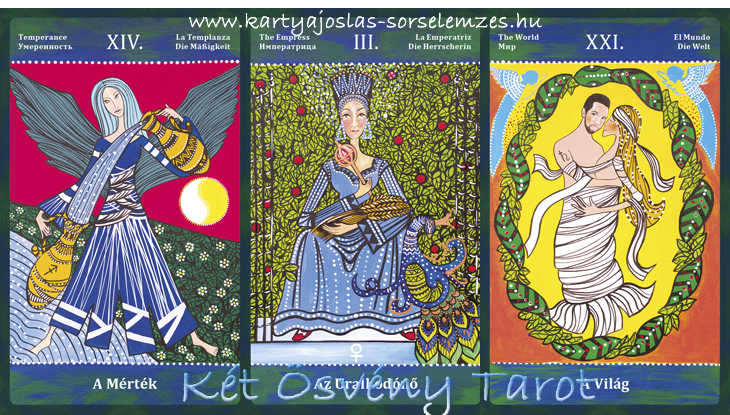 Lapjaink: a Mérték (XIV), az Uralkodónő (III), a Világ (XXI)
