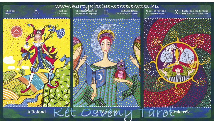 Lapjaink: a Bolond (0), a Főpapnő (II), a Sorskerék (X)